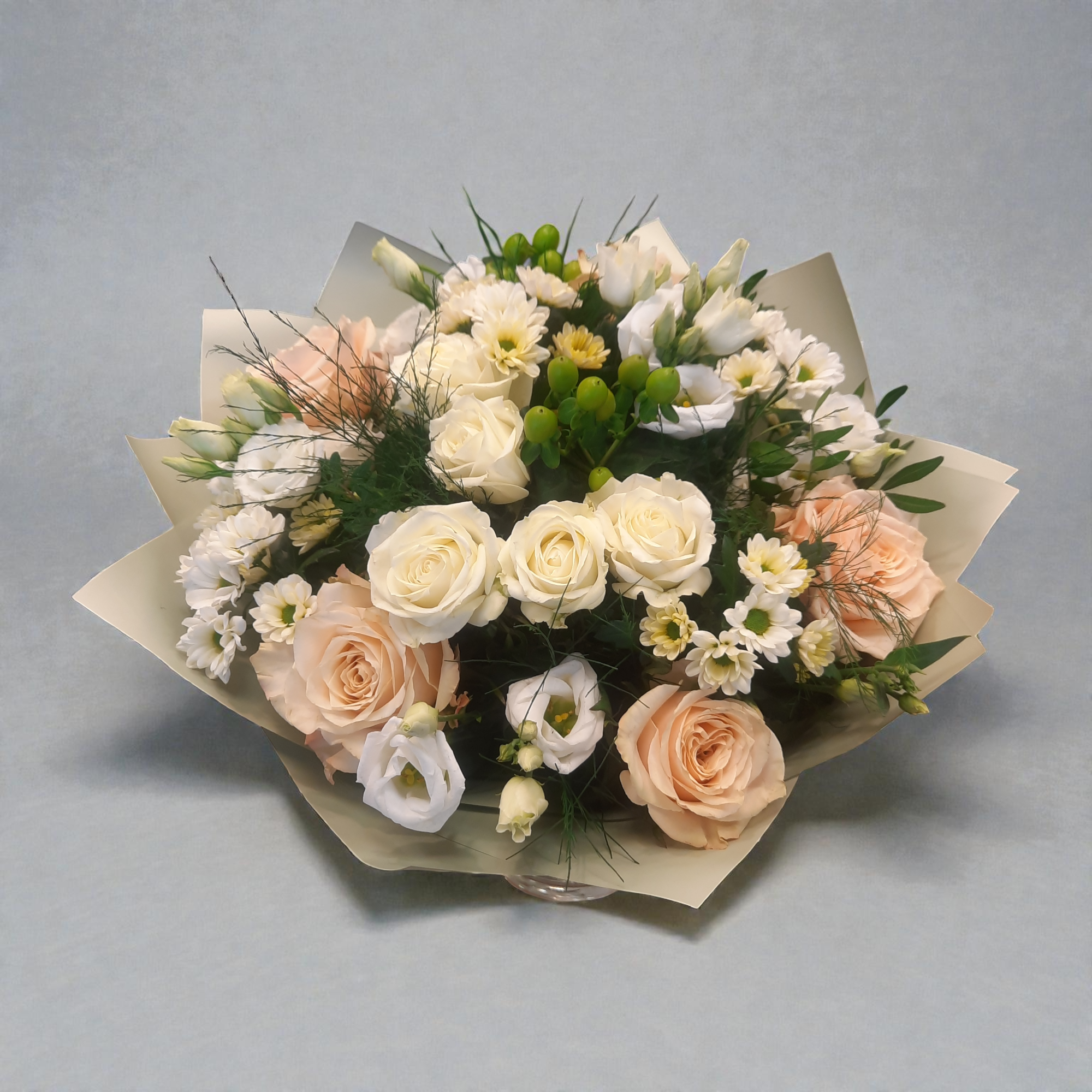 Pastesetes toonides ümarkimp, kus on kokku seotud roosid, krüsanteem, preeria kelluke, lisatud rohelist ning kinni köidetud mahedates toonides dekoratiivpaberiga.